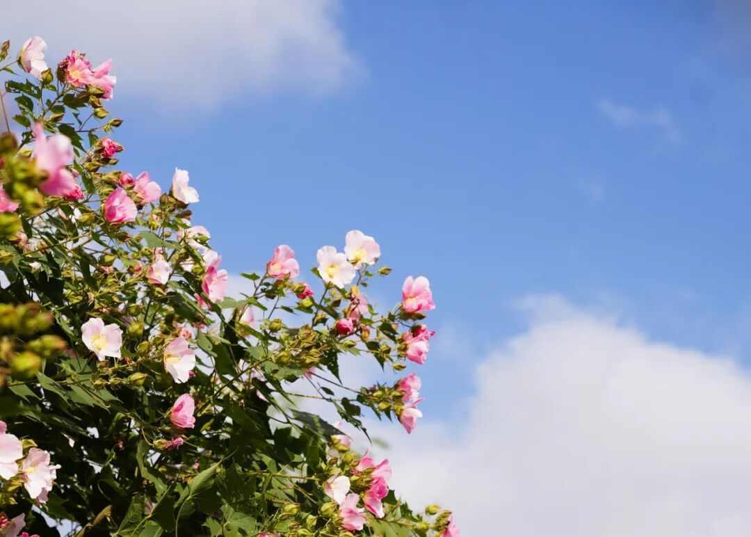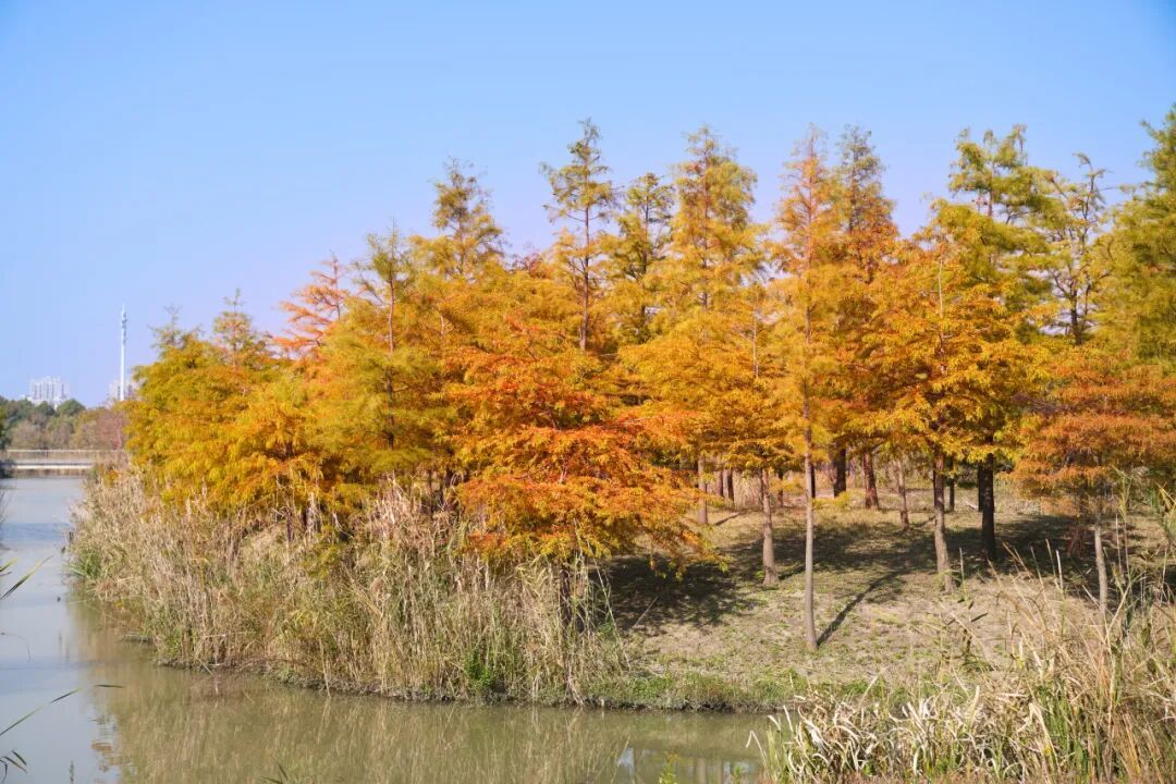 奉城中心公园的秋日更是惬意盎然,临水的落羽杉林在蓝天之下织就绚烂锦缎,风过枝桠簌簌作响,与岸边枯黄芦苇勾勒出灵动的水岸秋景。步道旁的木芙蓉开得正盛,粉白、粉红的花朵簇满枝头,在秋日晴空中晕染出温柔的花影。