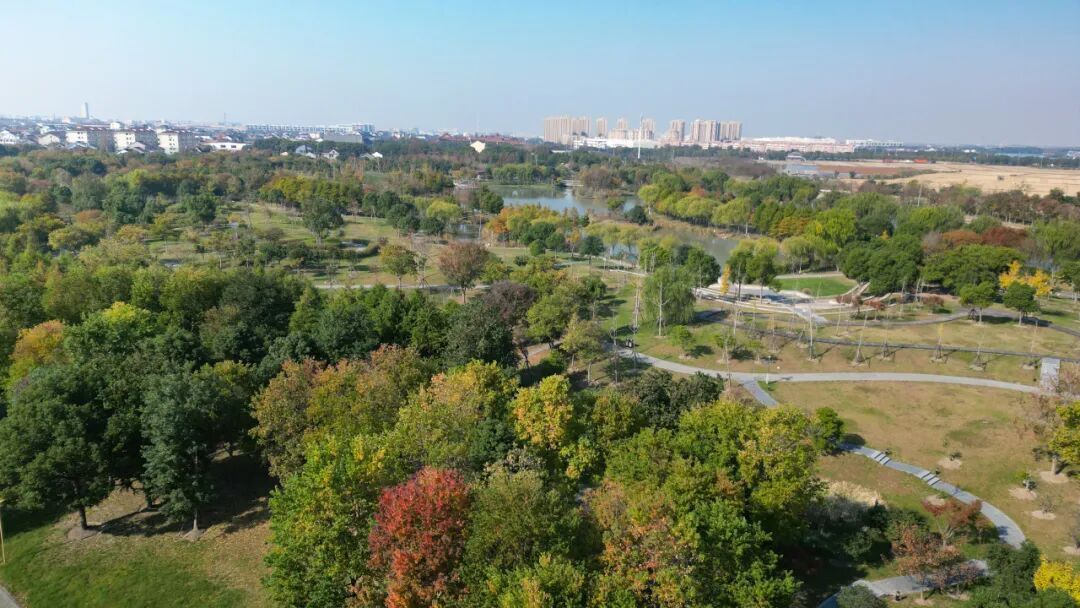 登高远眺,公园的秋意更显层次,林木错落成画,深绿、明黄、绯红交织出丰富的色块,蜿蜒的水域如银链穿梭其间,远处的建筑在秋色中静静伫立。