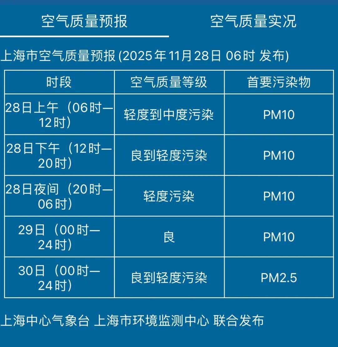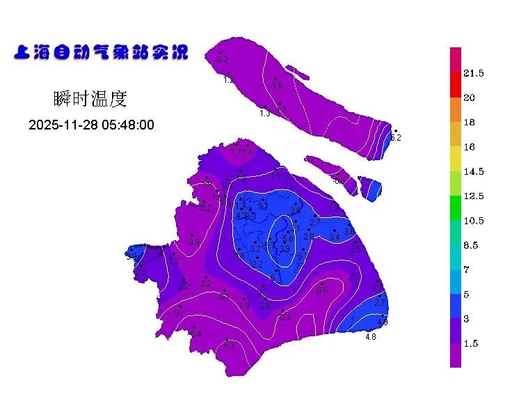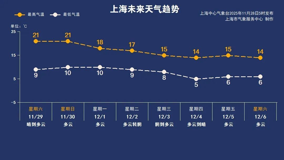 今日天气 今天(11月28日)是晴到多云的天气。早晨辐射降温明显,中心城区最低气温跌至5℃附近,多个郊区跌破冰点,其中最低的是崇明,只有-1.7℃,局部有薄冰,体感冷嗖嗖,大家注意保暖。白天阳光助力,最高气温回升至15℃。风力比昨天明显减弱,早晨偏北风,上午转南到东南风,风力3~4级;相对湿度60%~20%,依然干燥,大家注意用火用电安全。 上下班天气 上班(6—9时):晴到多云,6~9℃; 下班(16—19时):晴到多云,11~14℃。 天气趋势 冷空气影响过后,温暖的双休日在等待我们!最高气温可达21℃,天气晴朗,游玩洗晒两相宜。下周初起,本市转受一股“长效”冷空气影响,气温逐日下滑,周四早晨气温跌至低点,需及时添衣。 近期晴多雨少,空气干燥,气温起起伏伏,请大家注意天气变化,合理饮食、作息,谨防感冒,防火安全不能松懈。 未来几日天气 11月29日(周六):晴到多云,9~21℃ 11月30日(周日):多云,10~21℃ 12月1日(周一):多云,10~18℃ 12月2日(周二):多云转阴,9~17℃