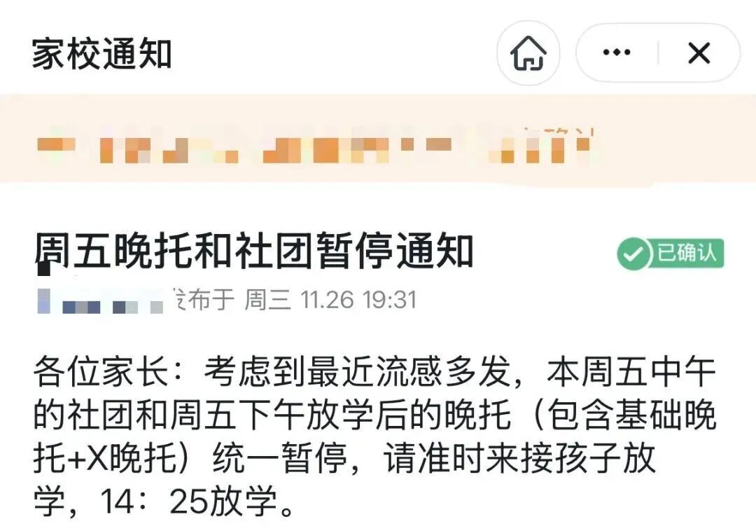 还有同区另一所公办小学的家长,收到了班主任发来的温馨提醒。考虑到最近流感多发,本周五中午的社团和周五下午放学后的晚托统一暂停。