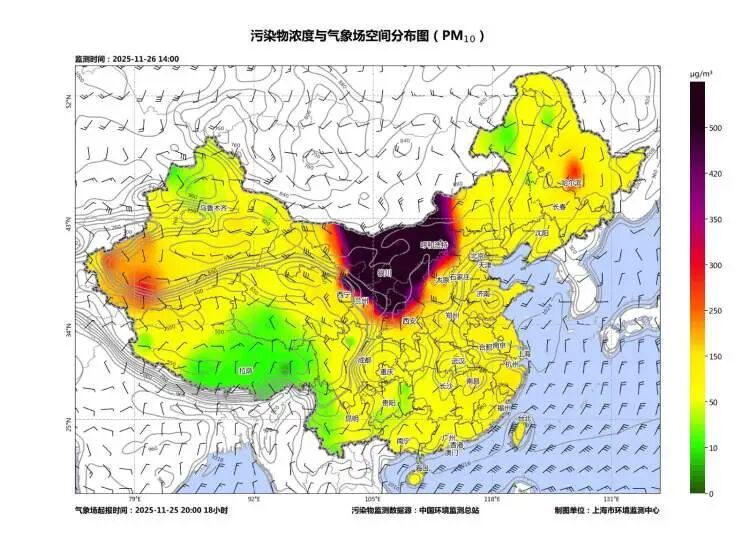 11月25日,蒙古国、内蒙古、甘肃、宁夏等地出现沙尘天气,PM10峰值浓度超过2000微克/立方米,达严重污染水平;26日夜间,在冷空气作用下,沙尘污染传输至长三角区域,27日7时,苏皖鲁豫地区出现PM10重度至严重污染,峰值浓度超过600微克/立方米。