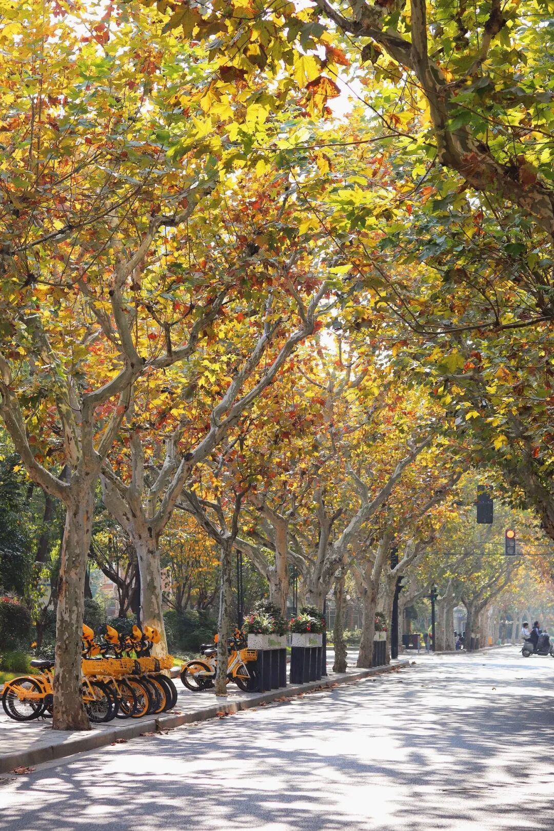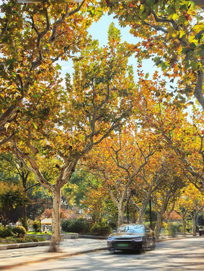 道路两侧的梧桐树叶逐渐发黄,在阳光的透射下成金黄色,树干间的投影会增强画面的立体感,无论拍摄大场景还是单拍树影都能入画。