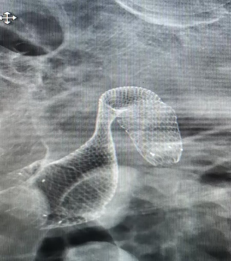 架设“生命之桥”:在放置支架时,因肿瘤形态导致支架与肠壁形成了一个危险的30度夹角,难以越过狭窄段。此时若强行推进,极易导致肠道穿孔,后果不堪设想。