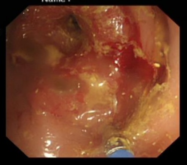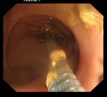 经内镜中心周联明主任医师与消化内科陈华副主任医师联合会诊,一致认为肠道支架置入术是当前对老人最有利的选择。在与家属充分沟通并取得支持后,手术于11月5日下午在数字胃肠镜室进行。在周联明的指导下,两位内镜护士默契配合,陈华迅速在大量粪便堆积的肠道内找到肿瘤所在的狭窄位置。