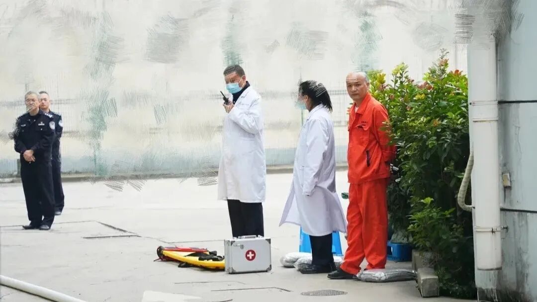 疏散组民警手持引导棒,高举疏散手势,口中清晰下达“弯腰捂鼻、贴墙前行、不要拥挤”的指令,带领罪犯沿预定路线快速有序跟进。灭火组携带灭火器、水带直奔“火场”,水带连接精准利落,对准火源根部喷射。警戒组快速封锁现场、维护秩序。医疗组在临时救助点严阵以待,急救箱、担架等设备随时待命。整个过程衔接紧密、忙而不乱,展现过硬战斗力。