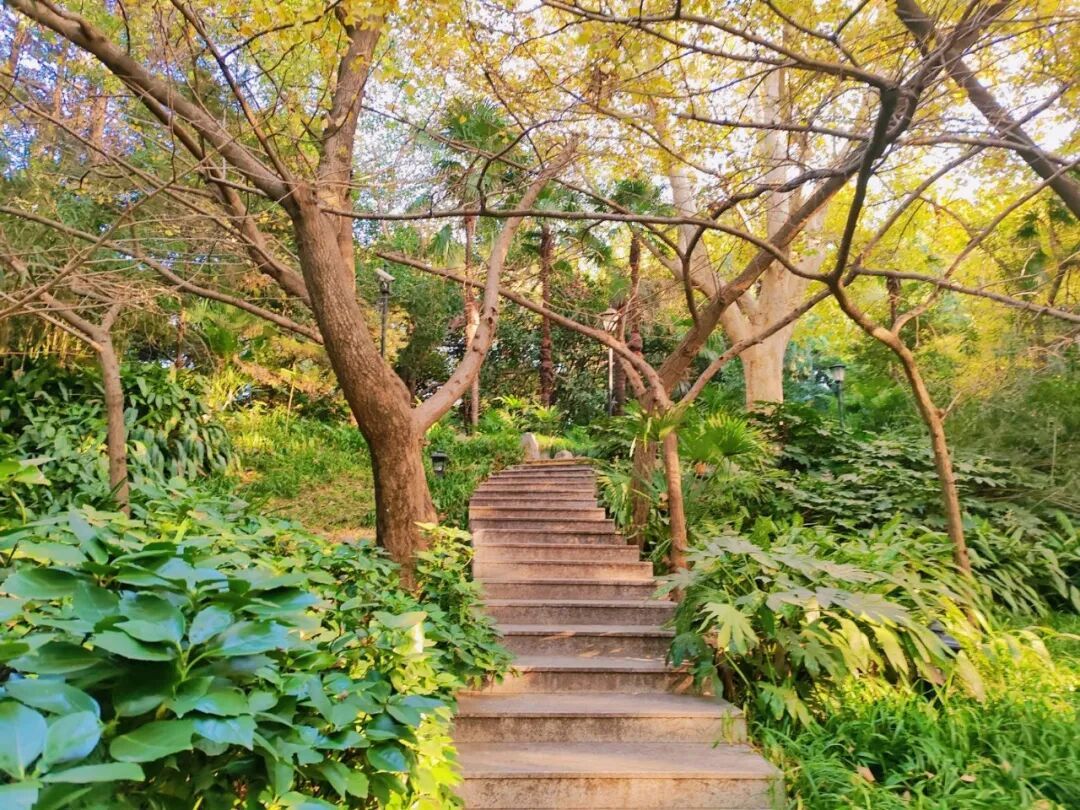 最具氛围感的,当数1号门与2号门之间的悬铃木景观道。黄色、红色、棕色的叶片交织错落,每一片叶子都像是精心绘制的艺术品,远观层次分明,近赏细节满满。晴好之日,阳光透过枝叶洒落,斑驳光影随脚步移动,行走其间,仿佛踏入“爱丽丝的神秘仙境”,步步皆是浪漫。