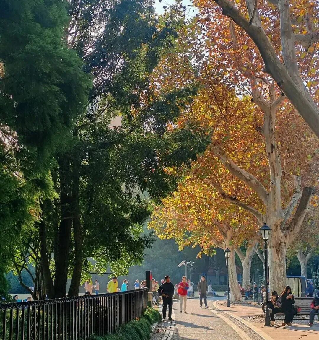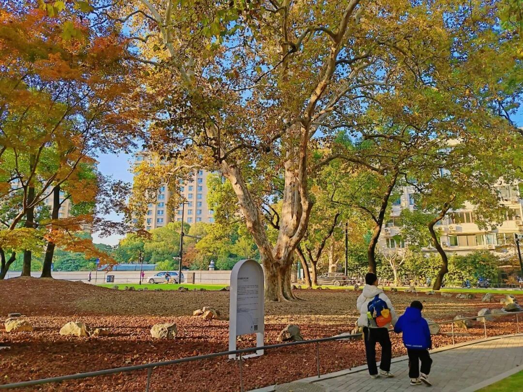 道旁那株150多岁的老悬铃木更堪称“镇园之宝”,独木成林的枝干撑起巨大的树冠,宛如一把五彩斑斓的伞,午后时分,无数光影在枝叶间洒落流转,吸引着市民纷纷驻足打卡,定格这份百年沉淀的秋韵。