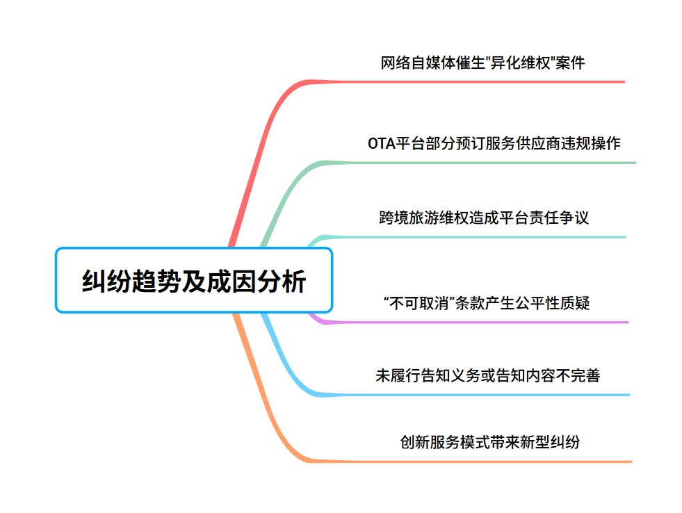 白皮书指出,该类纠纷的成因主要包括网络自媒体催生“异化维权”,OTA平台部分预订服务供应商违规操作,跨境旅游维权造成平台责任争议,“不可取消”条款产生公平性质疑,未履行告知义务或告知内容不完善,创新服务模式带来新型纠纷等。