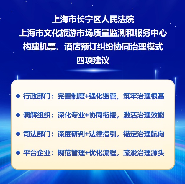对此,长宁区人民法院与上海文旅质监服务中心聚焦机票、酒店预订纠纷的治理关键环节,着力从三方面合力构建司法资源与行政资源深度融合的协同治理模式:一是强化纵向贯通,以上下联动促治理增效;二是深化横向协作,以内外协同助治理提质;三是构建一体化布局,以多维融合推治理聚力。