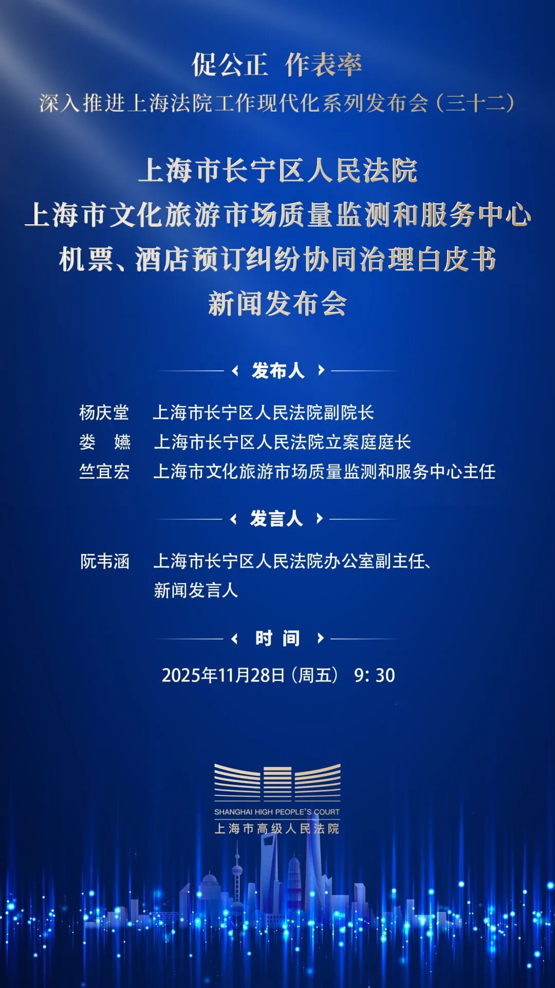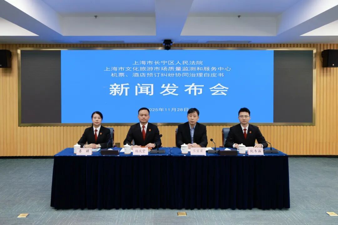 今天(11月28日)上午,上海市长宁区人民法院(以下简称长宁区人民法院)、上海市文化旅游市场质量监测和服务中心(以下简称上海文旅质监服务中心)联合举行新闻发布会,发布《机票、酒店预订纠纷协同治理白皮书》(2023 年10月-2025年9月)、《机票、酒店预订纠纷调解指导手册》,并通报5起典型案例。