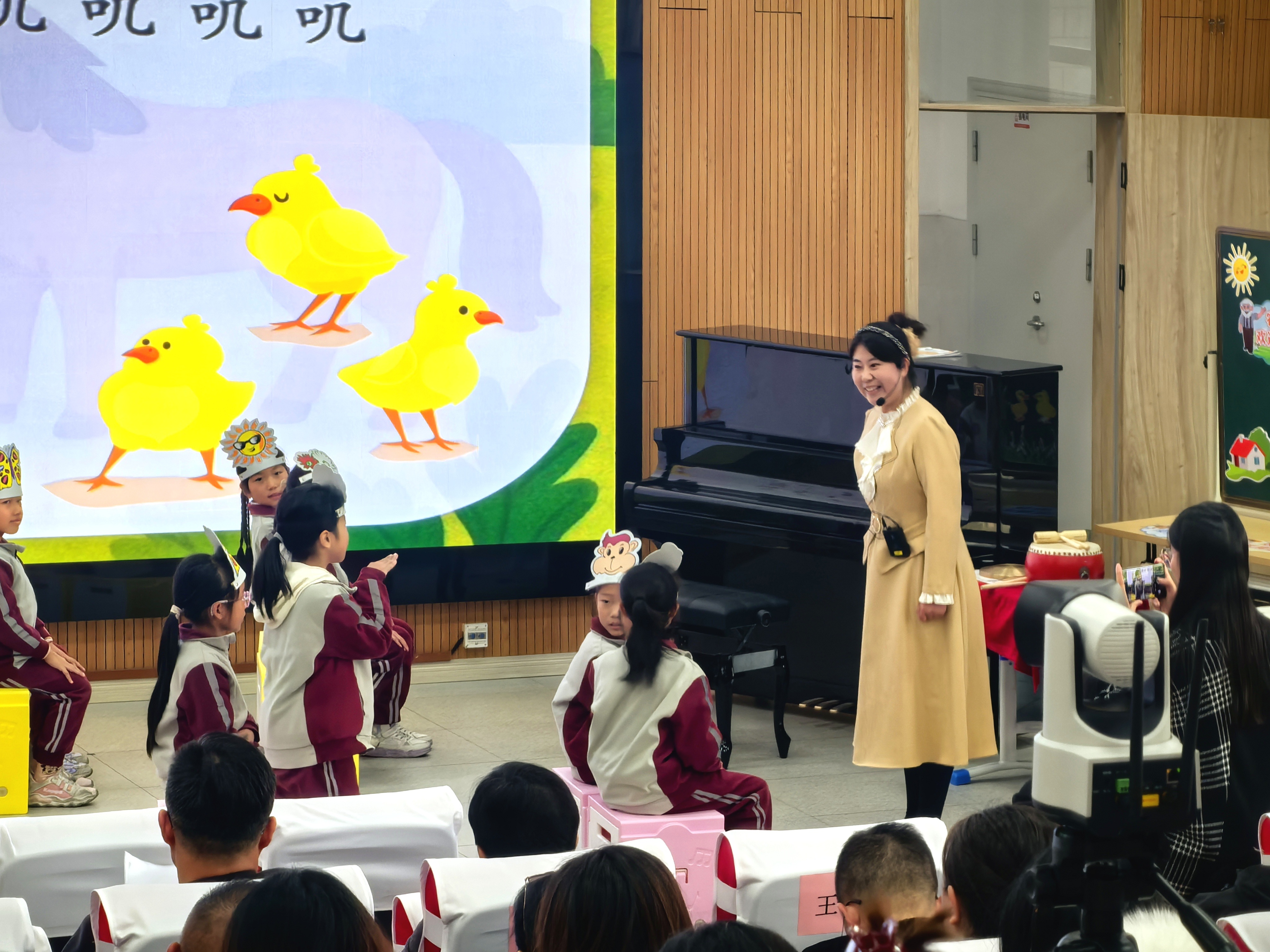 活动在洞泾学校“华韵”管乐团和“云之声”合唱团的精彩表演中拉开帷幕。正戏开场后,九亭二小音乐教师曲贵圆带领二年级的孩子们“飞”进了“农场”。在《农场里的声音》一课中,孩子们不仅竖起“魔法小耳朵”,认真辨别农场里的声音,还调动灵巧的小嘴巴,踩着节奏模仿起动物们的叫声。短短40分钟的课堂,还安排了“声音PK赛”“农场交响音乐会”“种玉米”“庆丰收”等环节,孩子们玩得不亦乐乎。