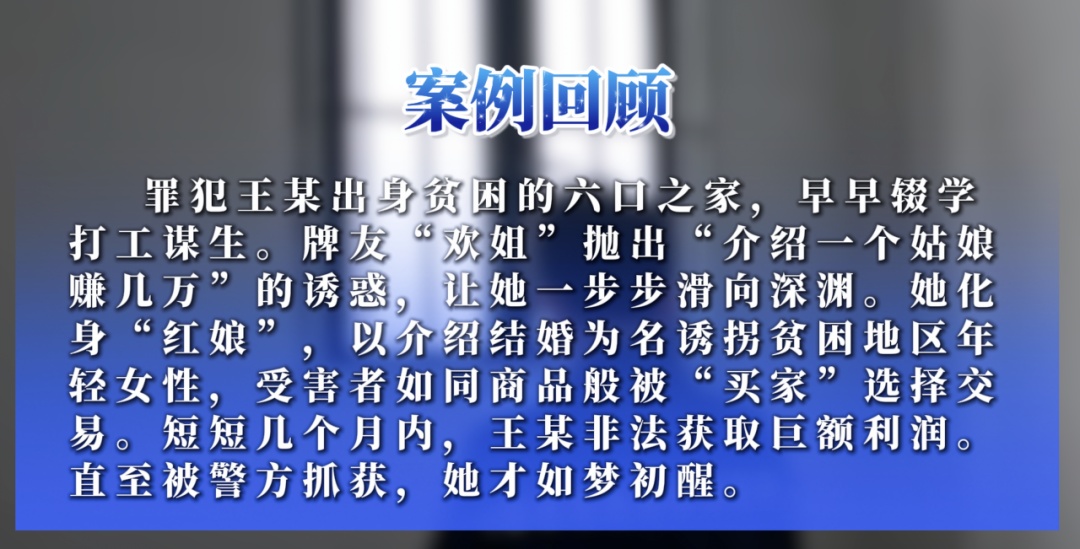 罪犯王某所谓的“婚介生意”,终被法律利剑斩断。守护妇女儿童“不被拐卖的人生”,既要法治高压、常打常严,更需全民参与、源头预防,让拐卖犯罪无处遁形。
