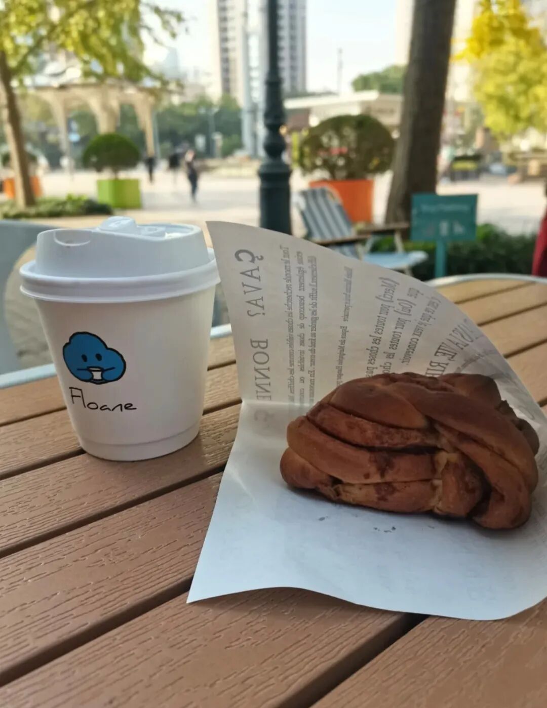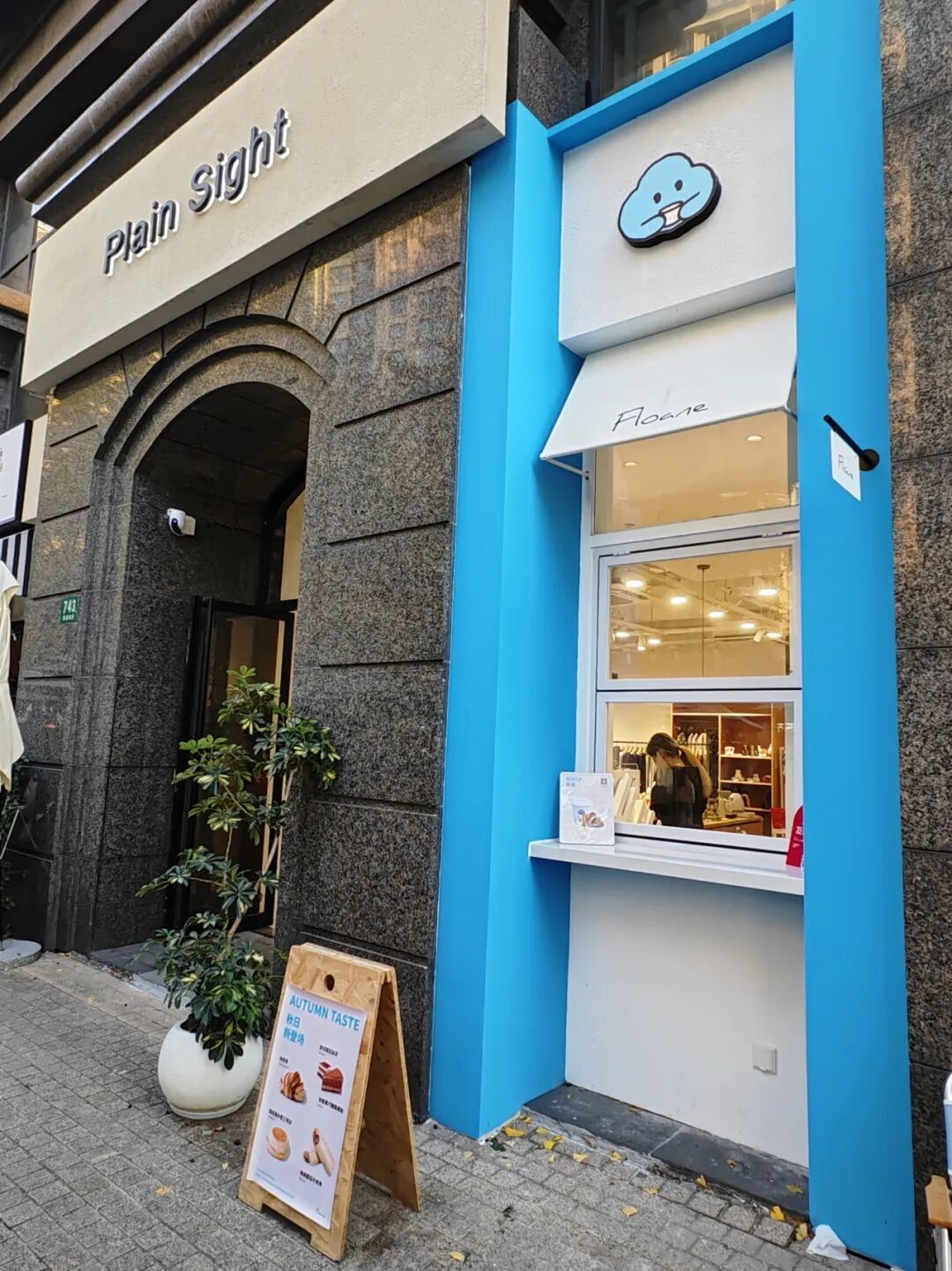 纯白外摆区与银杏叶相映成趣,蓝色门头点缀云朵装饰,清新感扑面而来。店内招牌肉桂卷香气浓郁,巧克力蛋糕细腻绵密,搭配一杯手冲咖啡,冬日幸福感瞬间拉满。