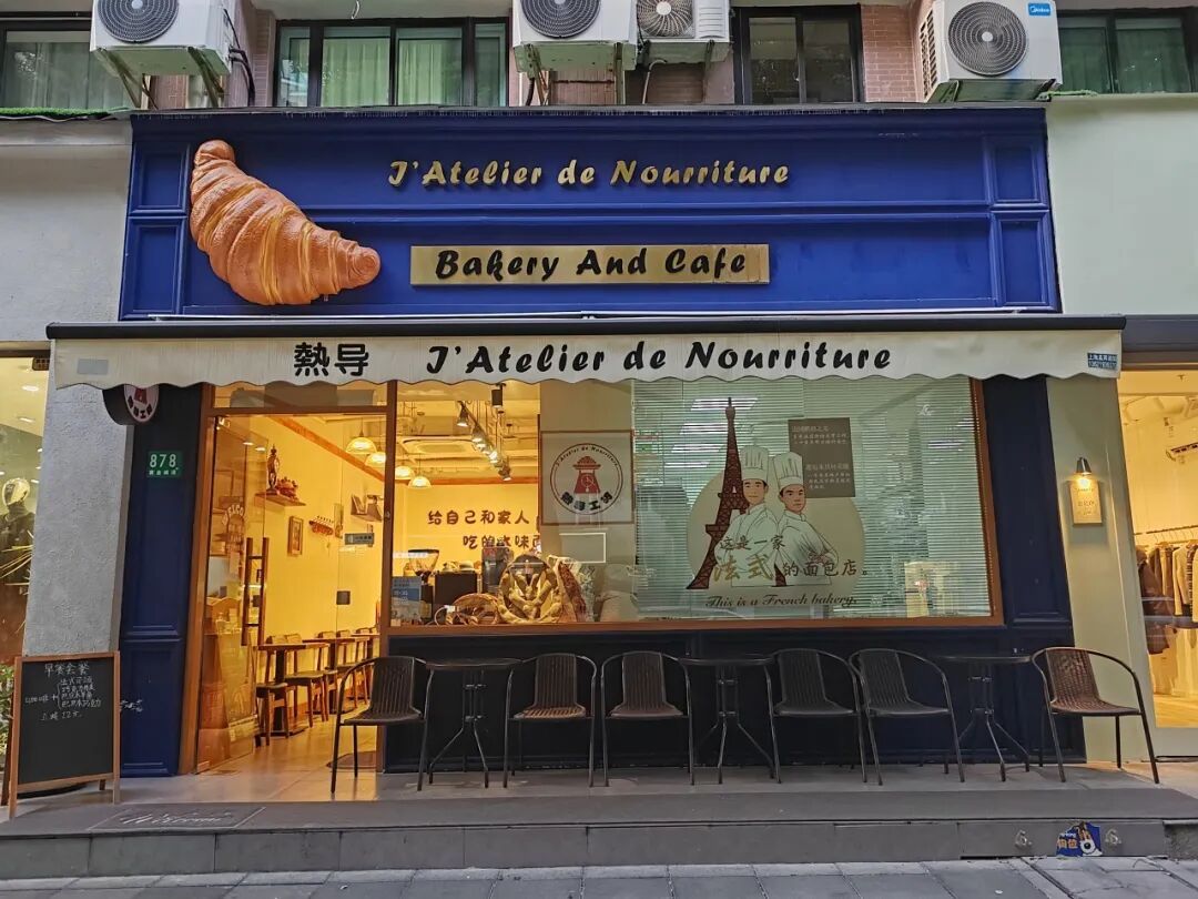 蓝色店牌镶嵌着巨型牛角包,格外吸睛。户外橱窗前的座椅尽显悠闲,随手拍出欧洲街头感。