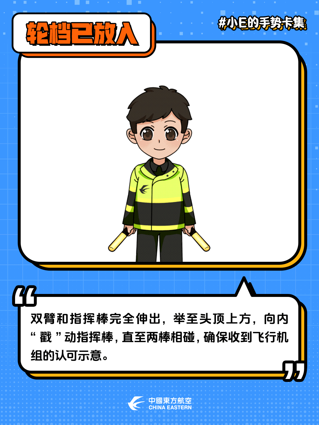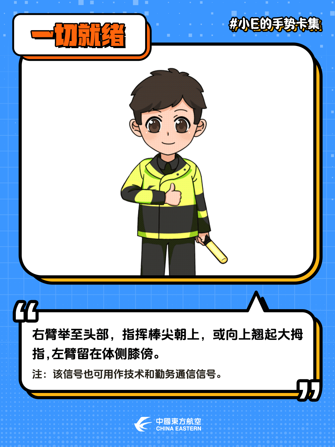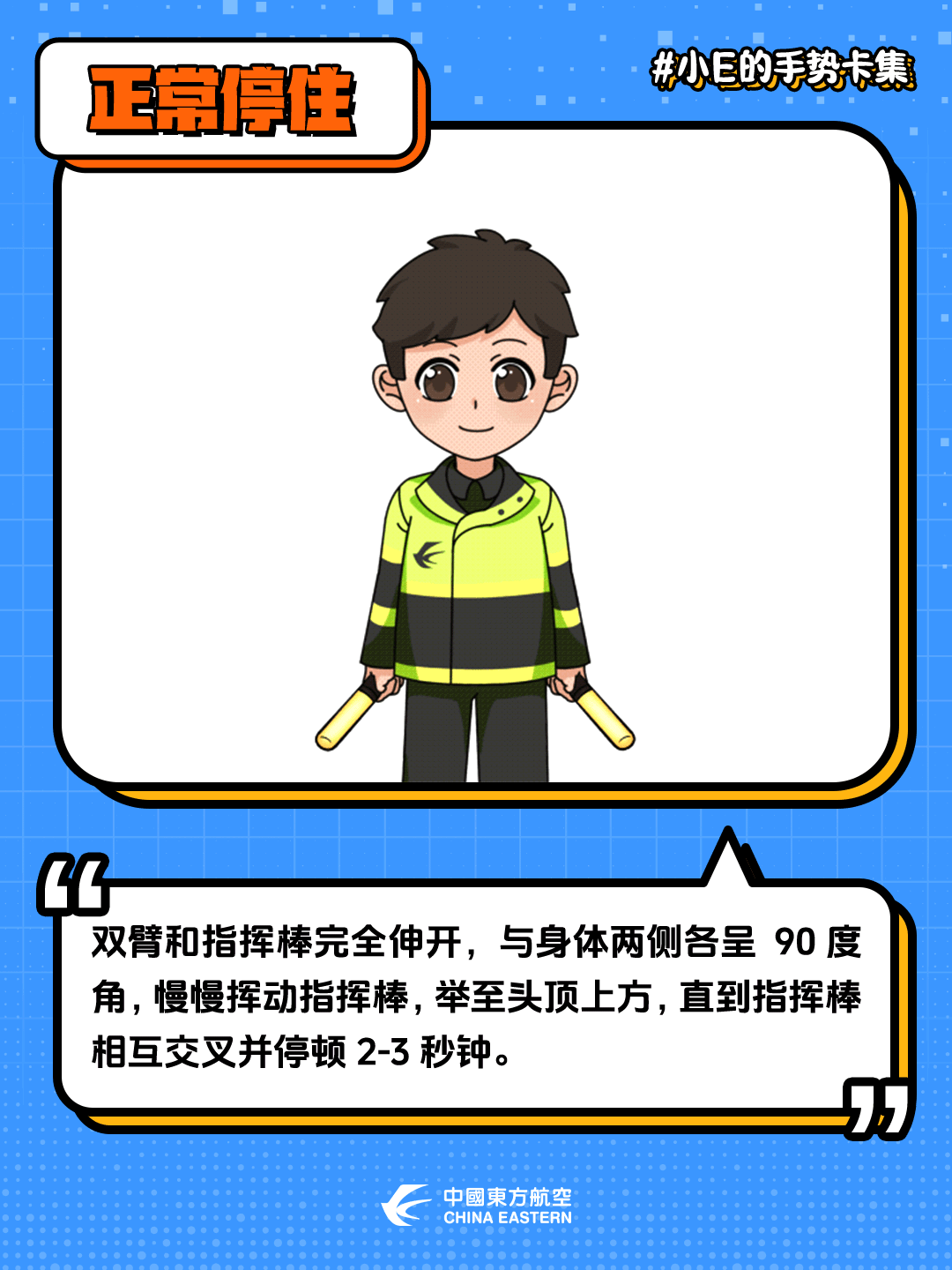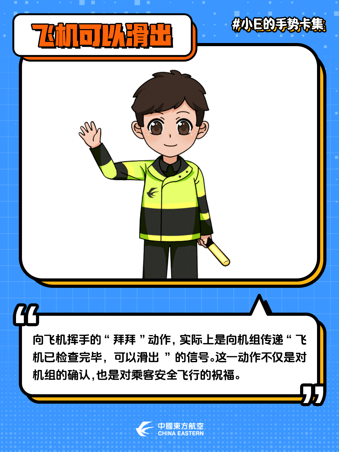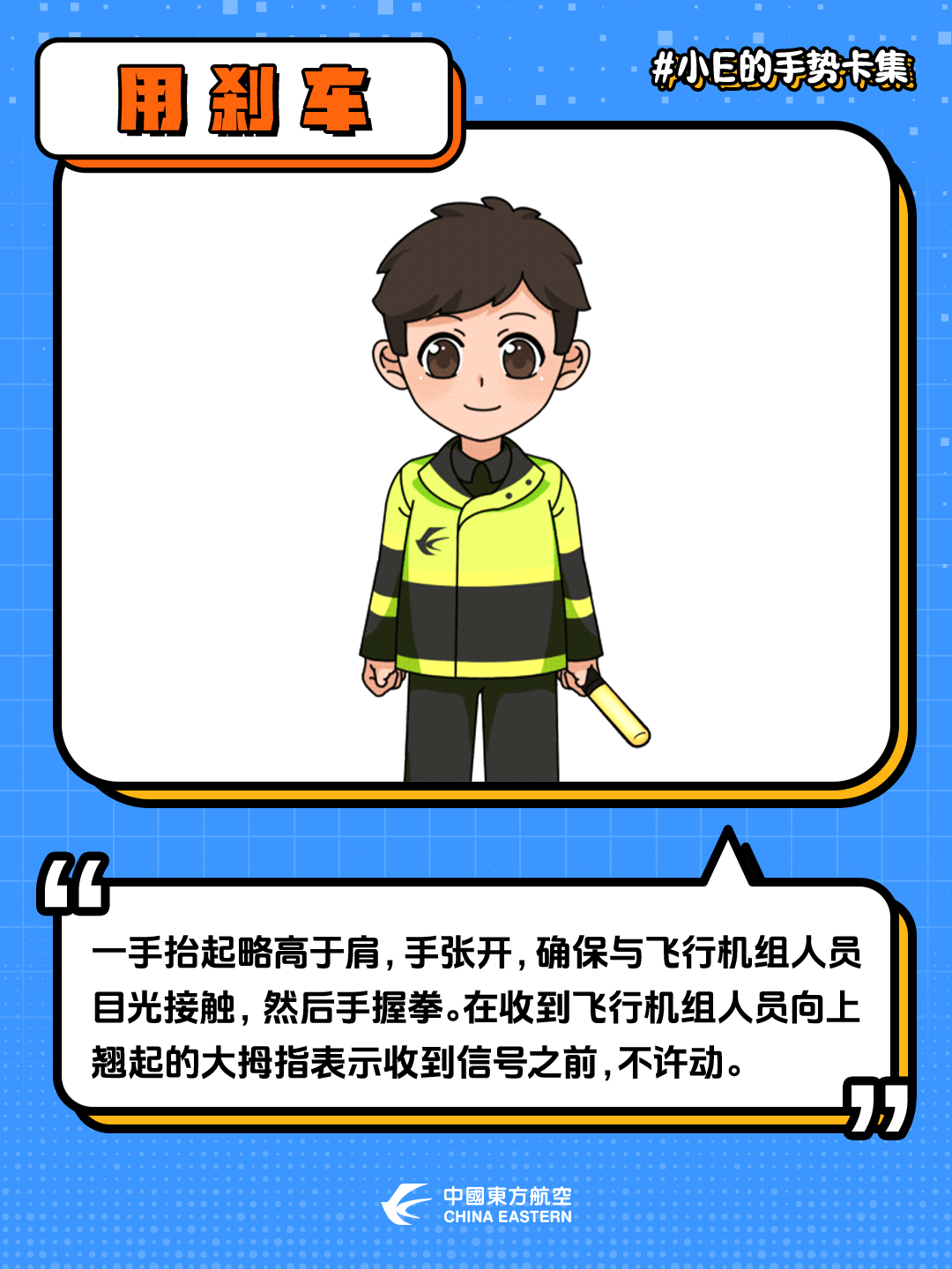 起飞前的精准确认、滑行时的默契引导、停靠后的细节收尾......每个动作都是小E们经过无数次的实操打磨,最终淬炼出的“手势眼神一对就懂”的默契,只为让机组精准接收每一条指令。手势里,藏着最严谨的专业,最踏实的安心。