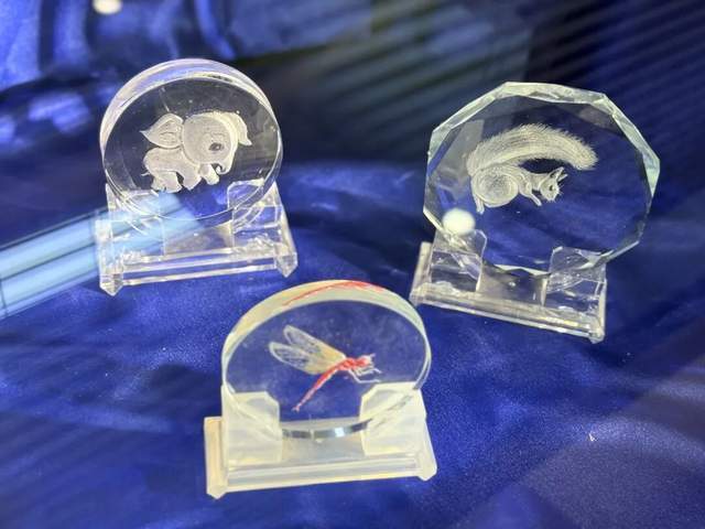 本次展览邀请到国家级非遗代表性传承人、古陶瓷修复专家蒋道银,展出其近年创作的三十余件非遗手工作品。蒋道银于上海博物馆文物修复领域耕耘数十载,其作品曾被多家博物馆收藏。此次展出的漆器、水晶雕等作品,不仅用料讲究、工艺精湛,更将传统技艺与时代审美相融合,展现出非凡的艺术价值与文化内涵。漆器温润如玉、纹理细腻,水晶雕造型生动、线条流畅,作品凝聚着匠人的心血与智慧,吸引居民驻足流连,赞叹不已。