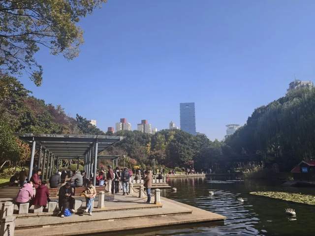 上午十点,趁着天晴,许多游客来到徐家汇公园散步散心。汇金湖畔,市民们聚集在岸边,享受温暖的阳光。吸引游客的不只是今日的阳光,园内草木呈现出澄黄、红褐、翠绿、深绿等斑斓的色彩,营造出美轮美奂的自然美景。