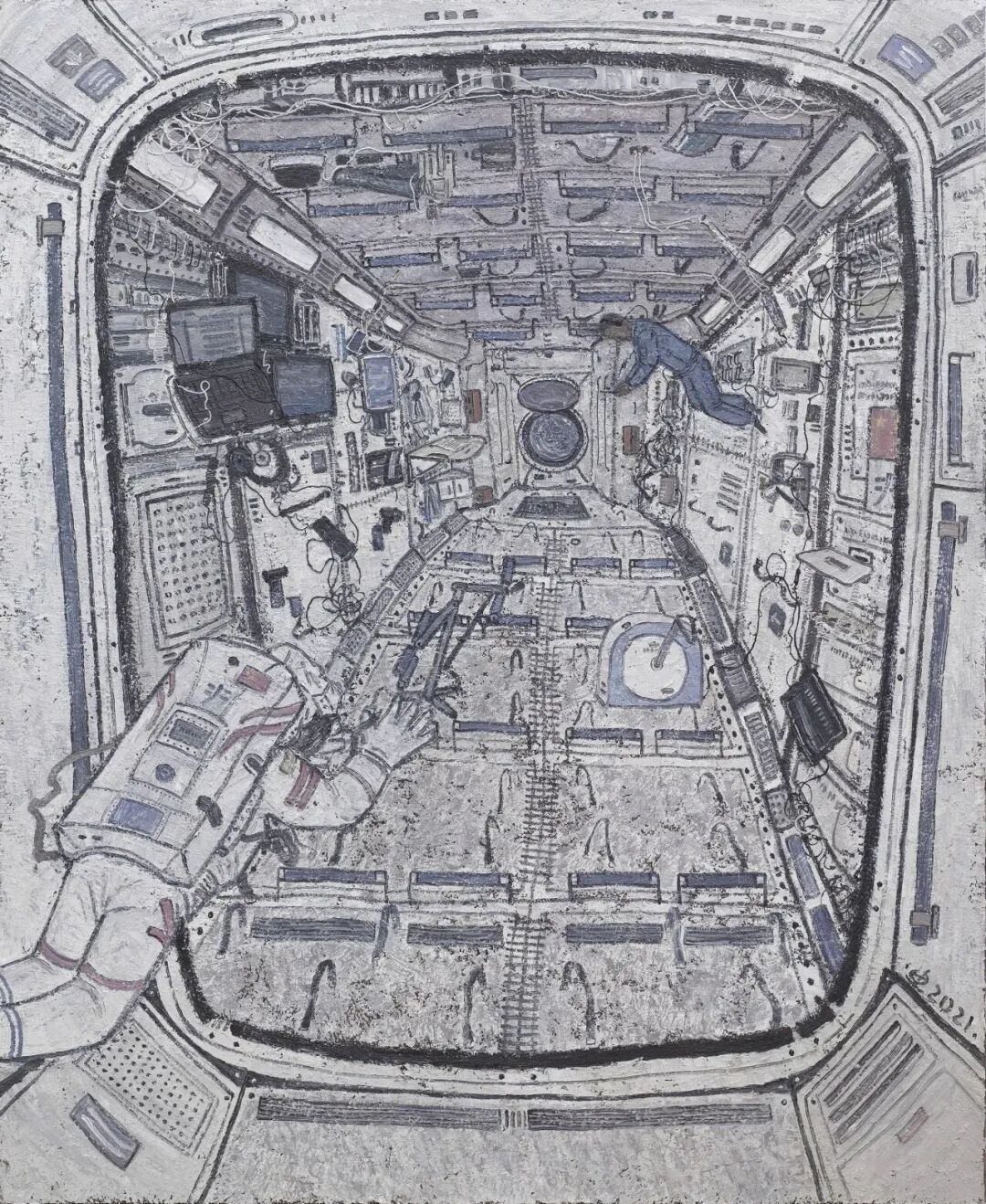 从《游走世博》出发,我陆续创作了“大风景”系列(《高速时代》《大烟囱》)以及人物系列(《拉面》《台前幕后》)等作品。中原文化的浸润,使这些画作始终带着质朴厚重的底色。随着逐渐融入上海,并在美协组织的采风、培训中结识同行、得到前辈指点,我的创作视角逐步转向日常室内空间,推出的《上海客厅》系列在色调上也愈发轻快明亮。此后,我的创作视野进一步拓展,《望志路106号》《2021•06•17》《直播间》等作品开始关注并探讨当代社会议题。这些作品也持续获得上海美协的推介,登上更广阔的展示平台。参与“百花迎春”2024春节大联欢上海分会场节目录制