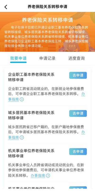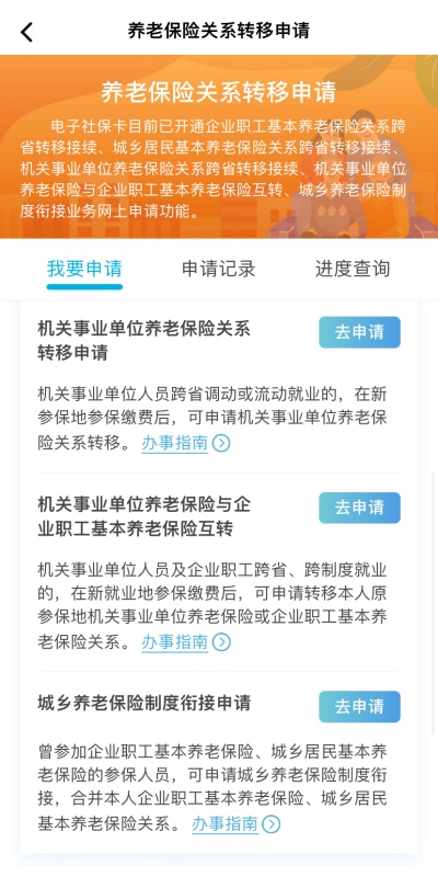 根据转出地和转入地的养老保险参保情况,选择对应转移类别,点击“去申请”。