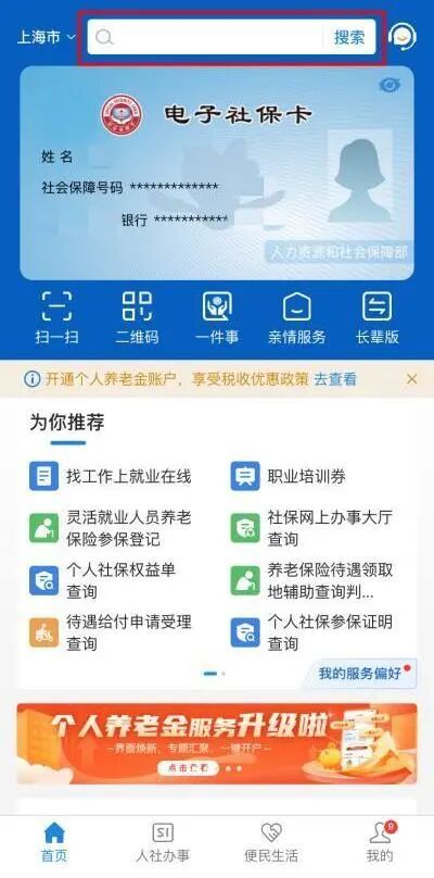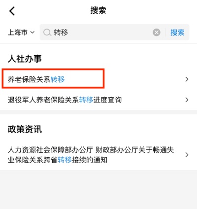 登录“电子社保卡”APP或在“随申办市民云”APP中搜索“电子社保卡”(您也可以在微信、支付宝中搜索“电子社保卡”小程序),在搜索框中输入关键词“转移”,并点击“搜索”。