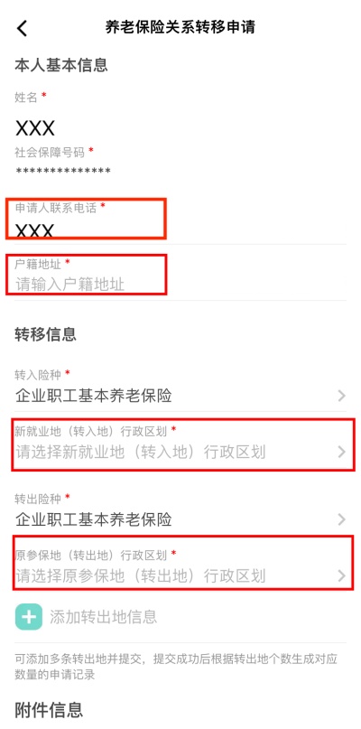 核对个人联系电话,填写户籍信息,并选择转入地、转出地行政区划。如有多个转出地,可自行添加转出地信息。