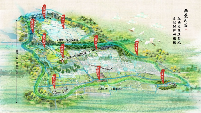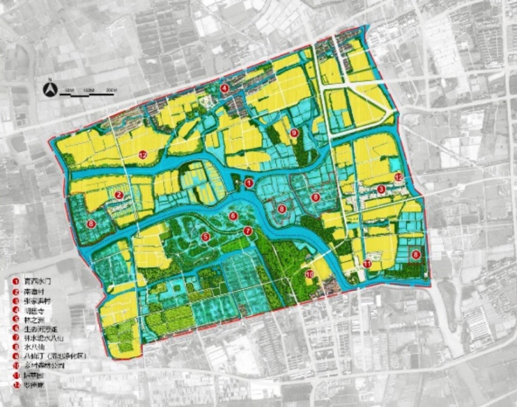 青西郊野控详试点选择具有上海典型水乡空间特征的青西地区,依托“三师联创”工作机制,由市规划院牵头,协同规划、景观、水务、土地等专业技术团队,精准识别历史基因、现状基因、规划基因,深入开展空间与功能的策划和谋划,按照“域、片、区、格、方”从宏观到微观开展不同尺度的空间规划设计。规划牢牢把握牛角郊野格“两水汇湾、四景成方”的空间基因底色底板,强调凸显自然生态功能,营造枕水而居、富有烟火气的水乡品质生活,拓展农文旅融合的郊野新业态,打造上海西郊具有典型江南文化特色的沪派水乡,形成上海超大城市郊野新空间的典型代表。 青西郊野单元牛角格鸟瞰照片 “三师”团队工作现场 规划以两水交汇处的“青西水门”为核心,以俞汇塘、横山塘为主脉,划分东塘、西田、南林、北湿特色风貌片区,形成 “一门、两水、四区”蓝绿基因结构。以郊野自然蓝绿基底和历史人文风貌为主要控制要素,对水、田、林、路、村等要素开展传承保护、整理修复和复合赋能。 青西地区总体设计方案 牛角郊野格蓝绿基因结构 牛角郊野格空间设计方案 牛角郊野格历史基因、现状基因、规划基因图则