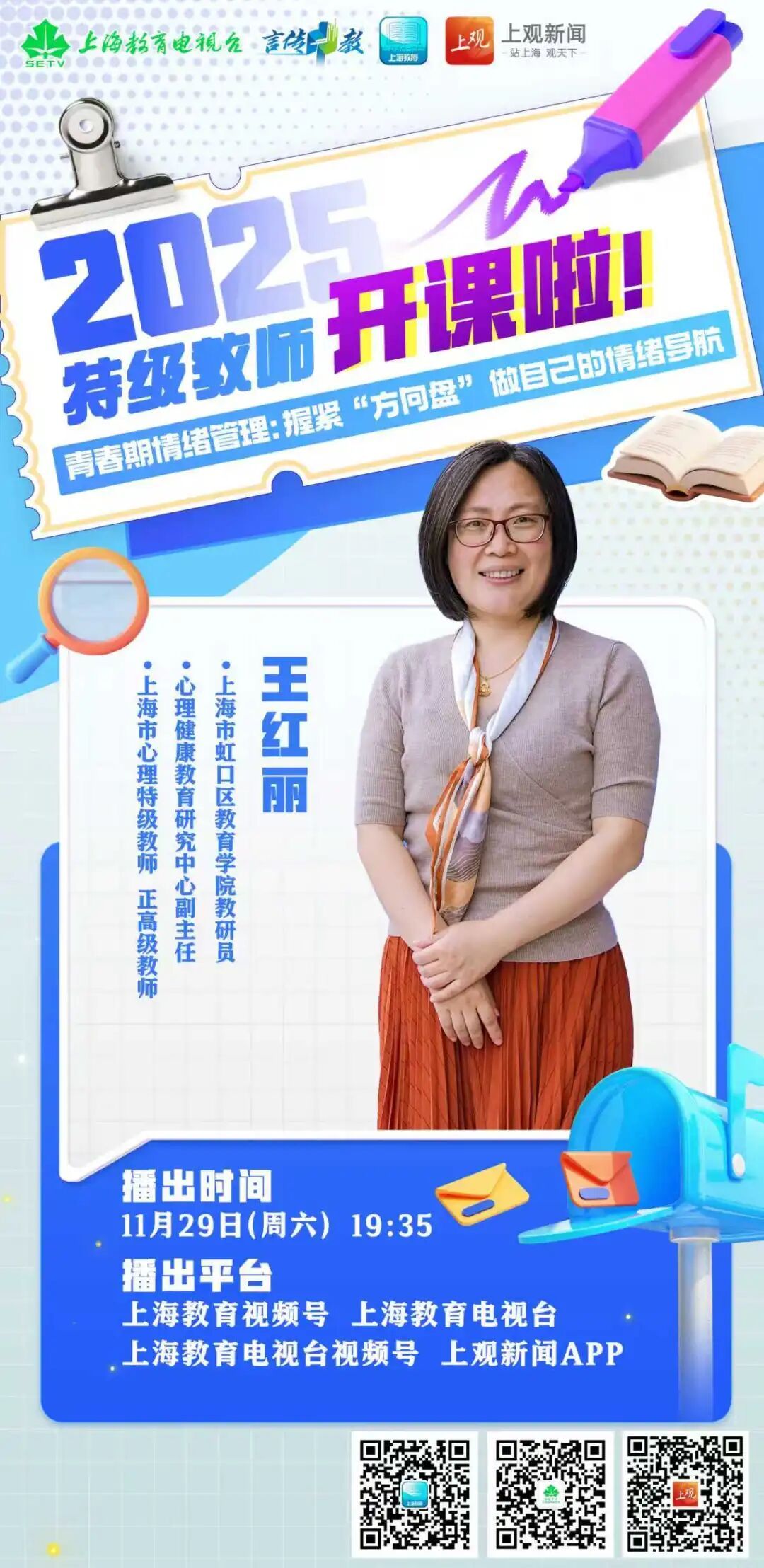 11月29日(周六)19:35,2025年“特级教师开课啦”将在上海教育视频号、上海教育电视台、上海教育电视台视频号、上观APP同步播出第七期。上海市虹口区教育学院教研员、心理健康教育研究中心副主任、上海市心理特级教师、正高级教师王红丽带来的讲座主题是青春期情绪管理:握紧“方向盘”,做自己的情绪导航。