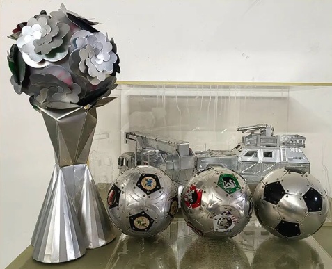 大场易拉罐画:作为宝山区级非遗,主要制作材料便于获得,仅用废弃的易拉罐,通过构图、修剪、塑形、黏贴和装裱便可完成一幅作品,工艺简单,可操作性强,环保且便于推广,更可利用易拉罐金属特性,进行雕、凿、刻使作品层次鲜明,图案多样,立体感强,更增添其工艺品的艺术价值。