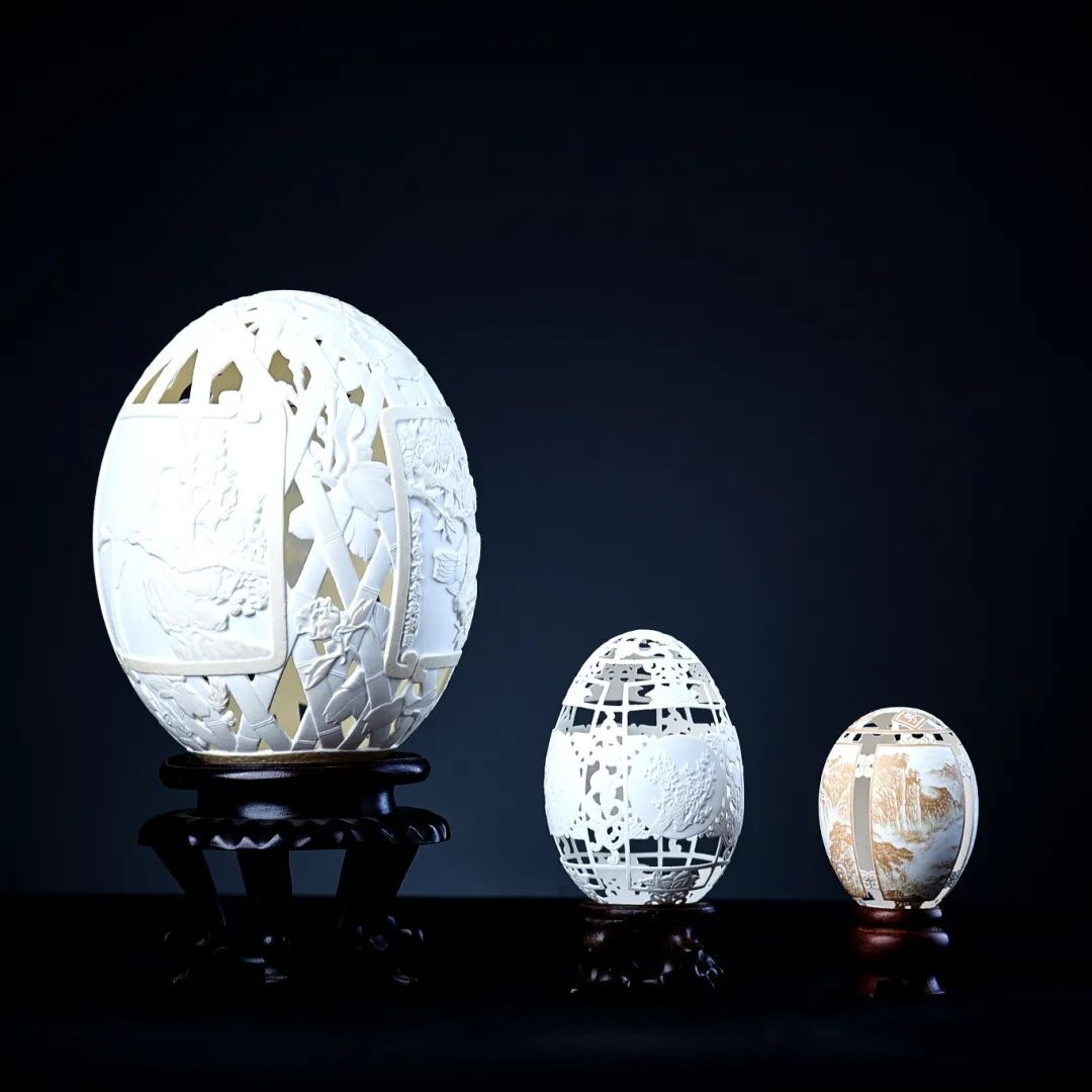 淞南蛋雕:最常见的选材有鸡蛋、鹅蛋、鸸鹋蛋和鸵鸟蛋,用各种雕刻技法在其表面上琢刻成各种造型的艺术品。它融合了绘画与雕刻,以浮雕、阴刻、阳刻、透雕、镂空等雕刻手法,通过对蛋壳表面的精雕细琢,从而表现所需的画面效果,借以反映风土人情、民间习俗、百姓喜好。