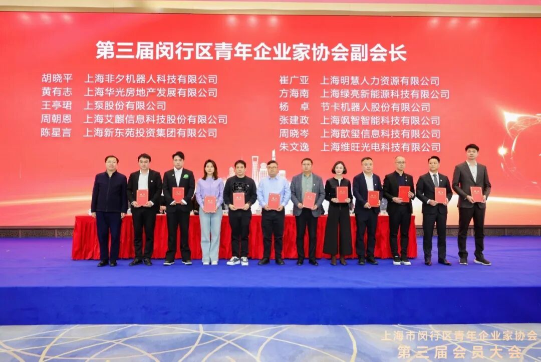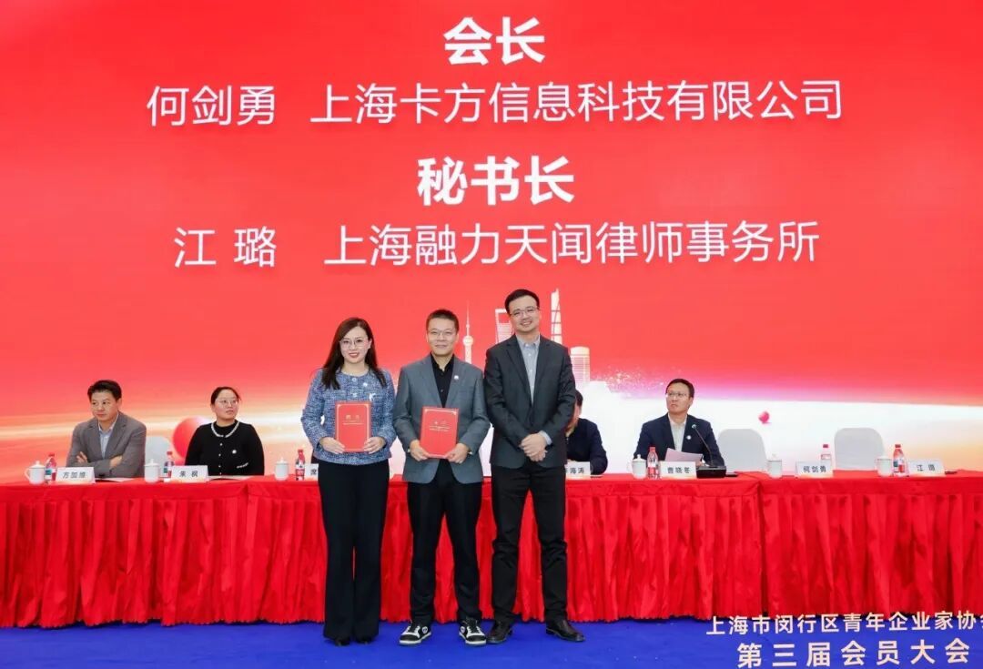 大会听取和审议了《上海市闵行区青年企业家协会第二届工作报告》,选举产生了闵行区青企协新一届会长班子、理事会和秘书长。经大会选举,上海卡方信息科技有限公司总经理何剑勇当选第三届会长,上海非夕机器人科技有限公司副总裁胡晓平等4位为协会执行会长,上海新东苑投资集团有限公司总裁陈星言等22位为协会副会长,上海融力天闻律师事务所高级合伙人江璐为协会秘书长。