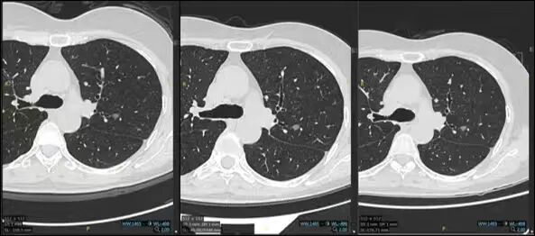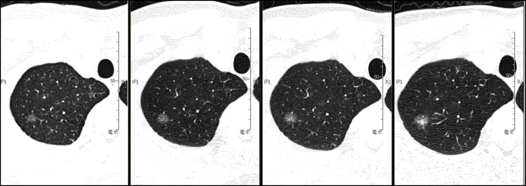 也有部分结节随着时间的延长,出现直径持续增大、内部实性成分增加或是边缘出现分叶、毛刺等恶性特征,这提示其具有活动性,恶性风险升高。