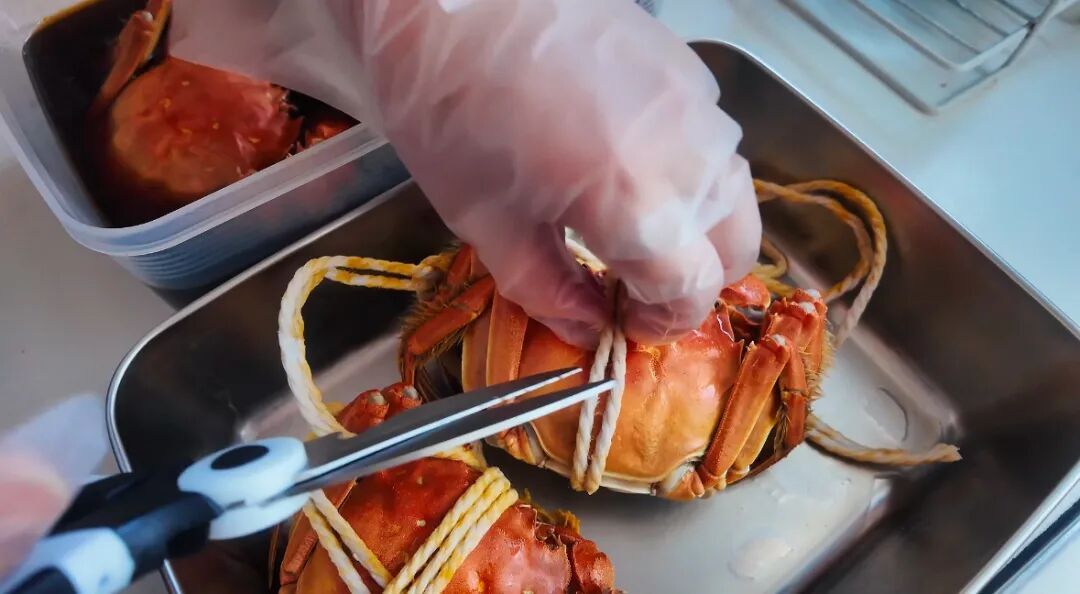 4.关火,将蟹捞出后剪去蟹绳,趁热把螃蟹放入卤料盆中。