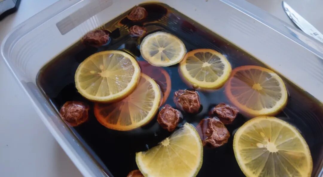 2.准备卤料:盆中倒入一碗卤、一碗花雕酒、适量柠檬片和适量话梅。
