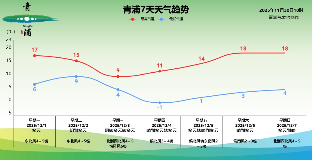下周青浦以多云天气为主,周一最高气温略有下降,整体在6-17℃。周二起有一股较强冷空气即将影响青浦,届时本区将有一次大风和降温的天气过程,周三全天气温都在个位数,在4-9℃,周四叠加辐射降温,最低气温将跌破零度。周五白天起气温开始回升。气温大起大落,还请大家及时关注气温变化,谨防感冒。