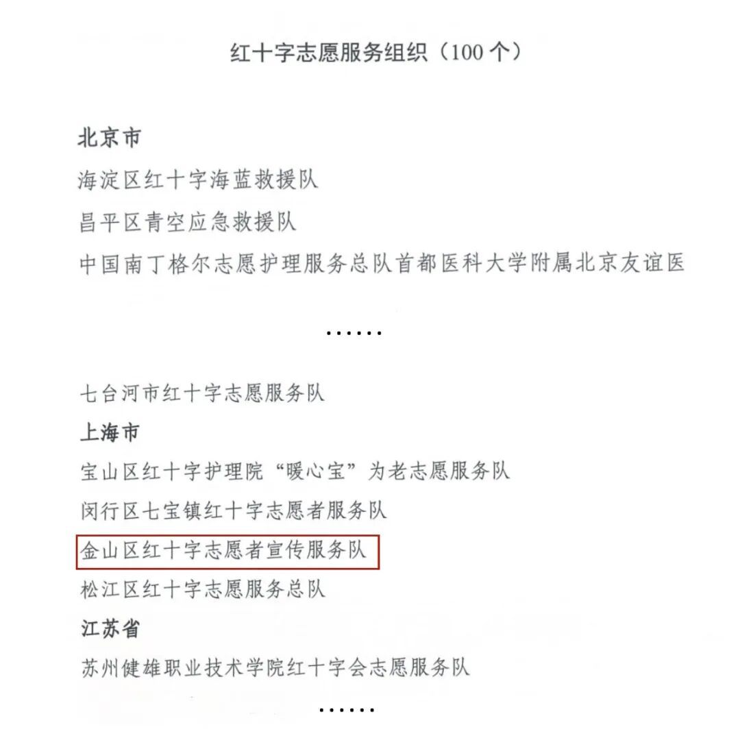 日前,中国红十字会总会下发了《关于表彰全国红十字模范单位的决定》。金山区红十字志愿者宣传服务队荣获“全国红十字模范单位”称号。