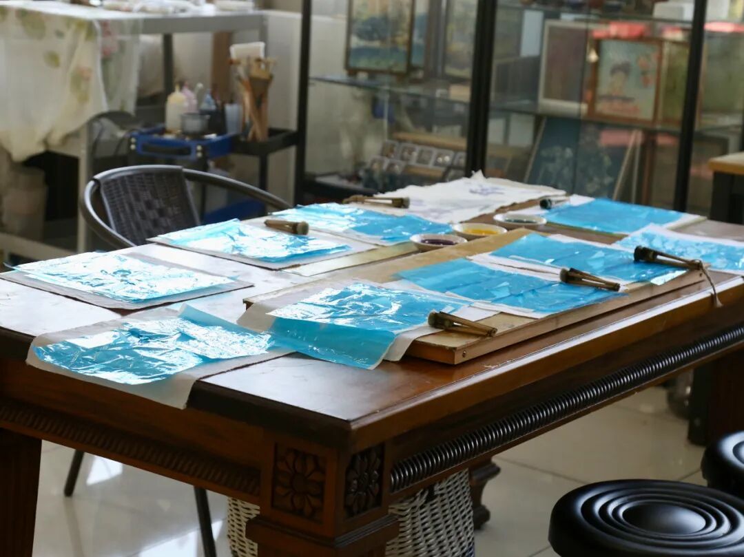 往里走,则是几间独立工坊,各类工具一应俱全,分别聚焦安亭药斑布、海派雕塑瓷、江南闺绣画、泊邻剪纸艺术、海派彩色蜡染,将非遗技艺转化为可感、可触的生动课堂,让古老技艺跃然指尖。