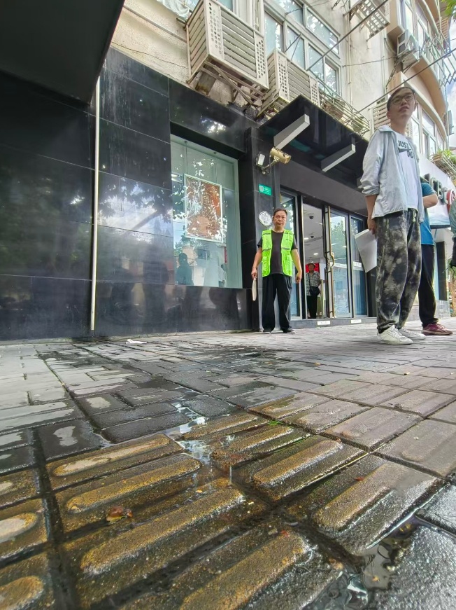 10月,曹家渡街道西片综合网格组织力量开展街区巡查时,发现万航渡路某沿街商铺前人行道上有积水,影响商户经营与市民通行。