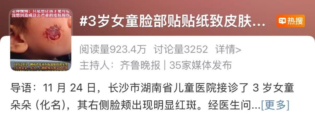 11月24日上午,湖南省儿童医院皮肤科诊室里,一名3岁女童右侧脸颊有明显的红斑。据了解,女童所在的幼儿园为筹备节日活动,老师们从某电商平台购买了一批贴纸,贴在孩子脸部。