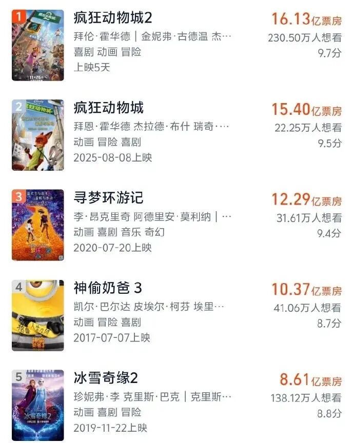 目前,《疯狂动物城2》在豆瓣上的评分虽不及前作的9.3分,但也达到了8.6分的高位。