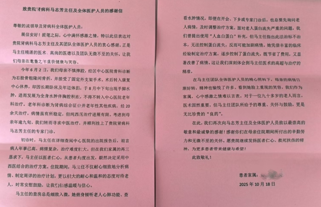 经过半月余系统治疗,患者水肿逐步消退,精神状态显著改善,家属在感谢信中写道:“马主任团队的医术与关怀,让老人在暮年重获笑容。”这不仅是个人康复的胜利,更是中医外治疗法在老年复杂病症中价值的生动例证。