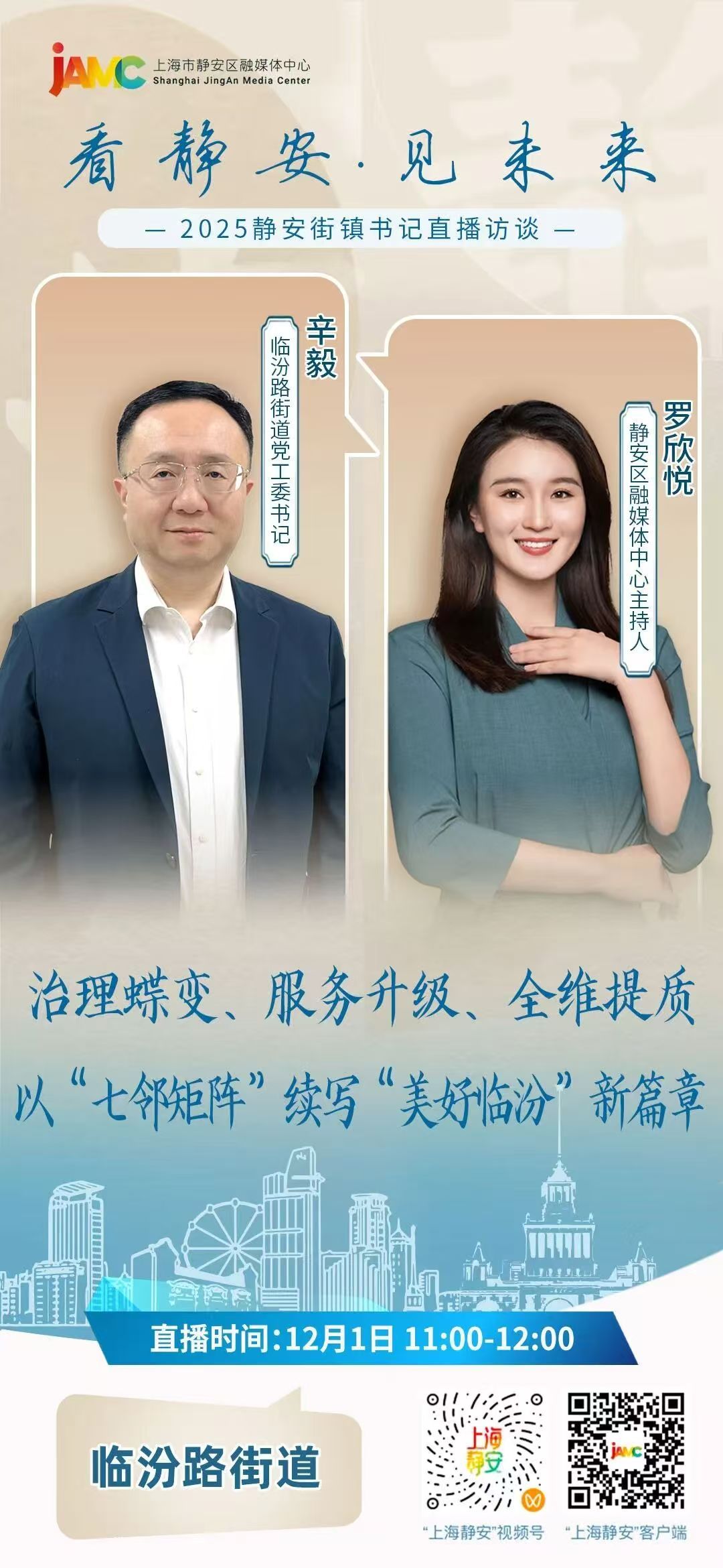 12月1日11:00—12:00,临汾路街道党工委书记辛毅、静安区融媒体中心主持人罗欣悦,与您相约“看静安·见未来”2025静安街镇书记直播访谈。