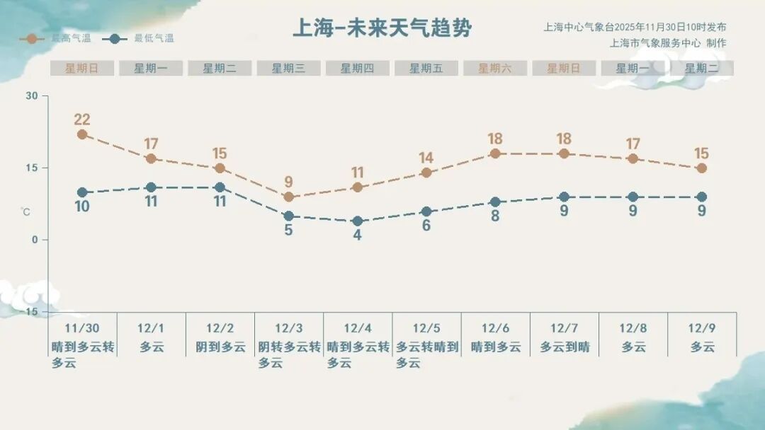 上海中心气象台预计,下周一本市受东路冷空气影响,气温将会下滑至11~17℃左右。下周二到下周三,申城将迎来新一轮较强冷空气,预计冷空气影响将会持续至下周五,请市民及时关注最新报道,留心下周气温变化。