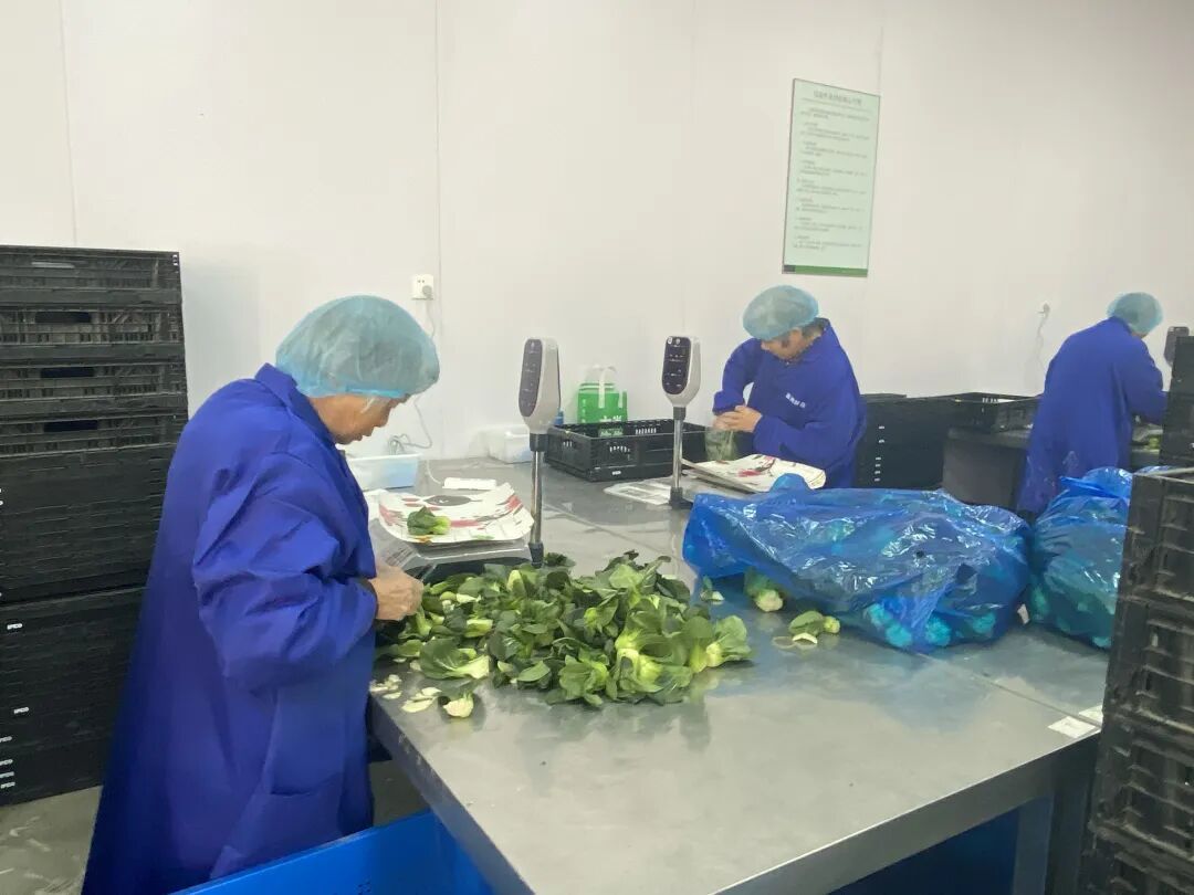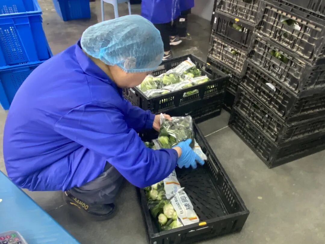 上午九点,记者来到瀛洲鲜品农业供应链园区,工人们正手脚麻利地将刚从田间采收的蔬菜进行分拣、称重、包装,各类蔬菜快速流转,经过初检、装箱、贴标后被整齐码放至暂存区,工作人员根据当天接收的订单,进行分解、配货、装车,现场一片繁忙。