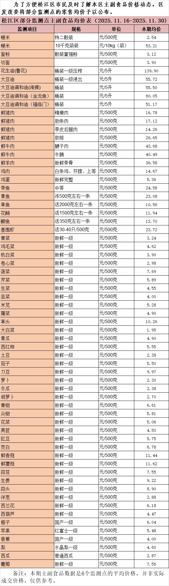 区发改委今天(12月1日)公布2025年11月16日至30日本区部分监测点主副食品的零售均价,以方便市民及时了解本区主副食品价格动态,具体见下表。