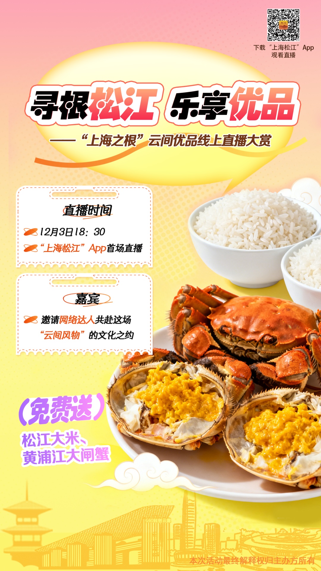软糯飘香的松江大米、膏腴肥鲜的黄浦江大闸蟹直达餐桌!12月3日晚上6:30,“上海之根”云间优品线上直播大赏首场直播即将热力启幕,锁定“上海松江”客户端,不仅能免费抽到“云间风物”,更能跟随“专业主播+品牌推荐官”的脚步,解锁“云间风物”的文化密码。