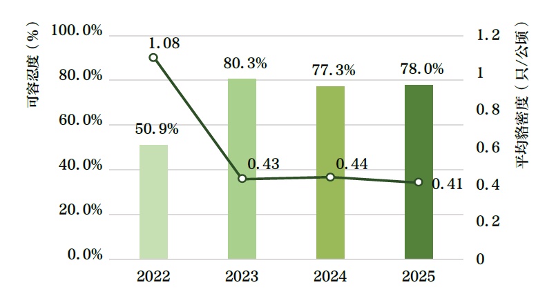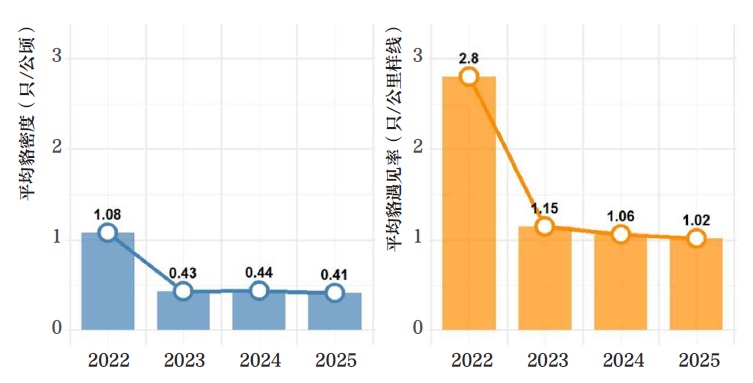 在112个小区中,102个小区有貉分布,占91%。有貉小区的貉平均密度为0.41只/公顷,平均貉遇见率为1.02只/公里样线。而在2022年首次调查时,这两项数据分别为1.08只/公顷和2.80只/公里样线,4年来分别下降了62%与63.6%。与去年相比,也分别下降了6.8%与3.8%。