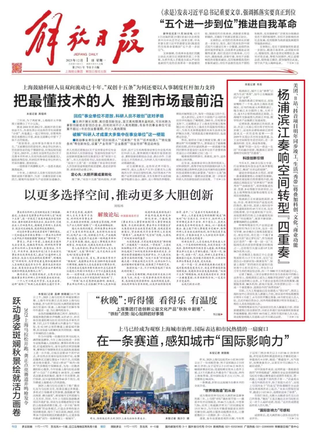 今天(12月1日),解放日报头版刊文《杨浦滨江奏响空间转型“四重奏”》,聚焦科技创新引领、文化商业融合、生活品质提升三大内容,系统阐述杨浦滨江这条昔日的城市工业“锈带”已成为生活“秀带”,如今正崛起新的产业“金带”。