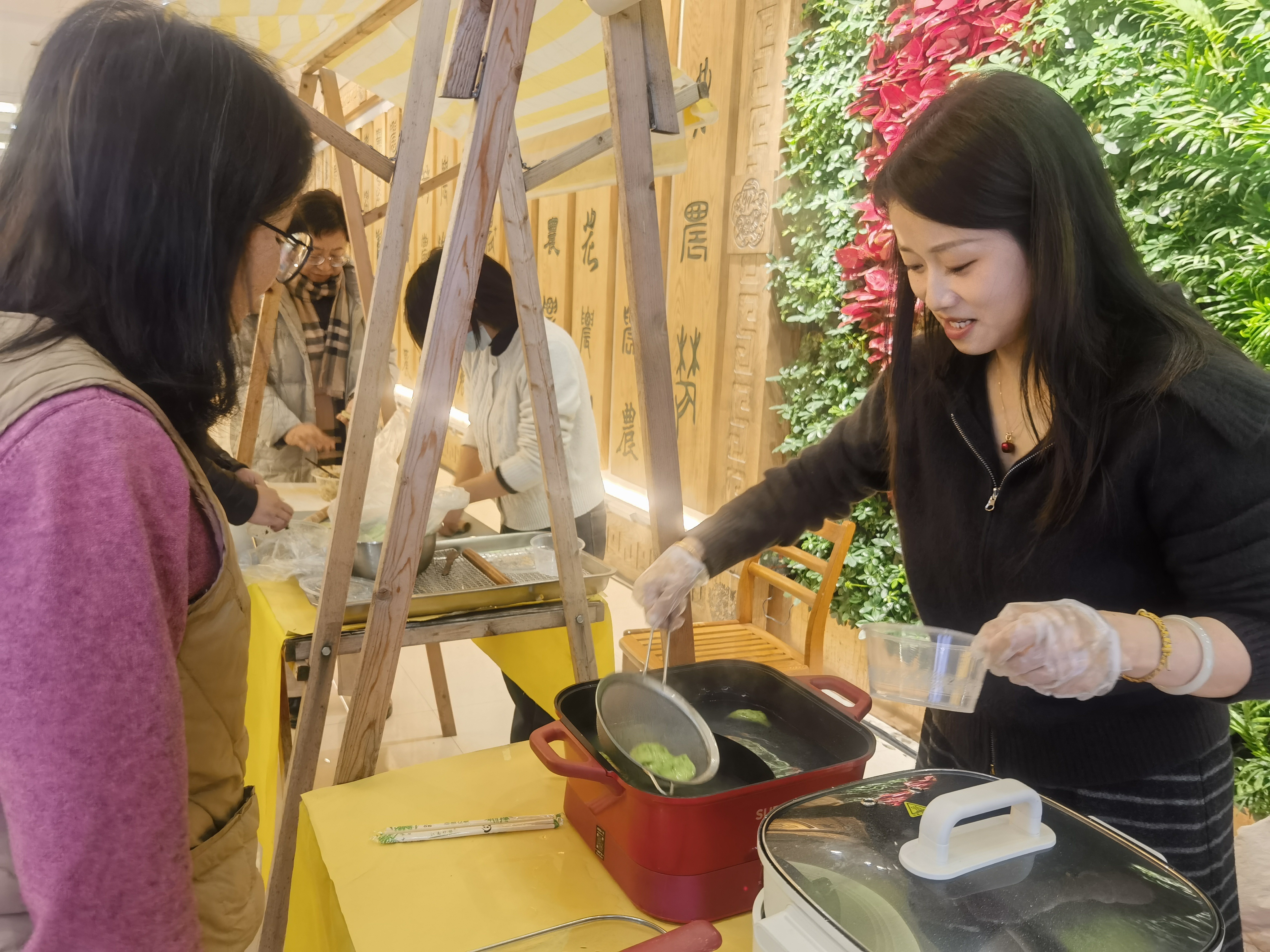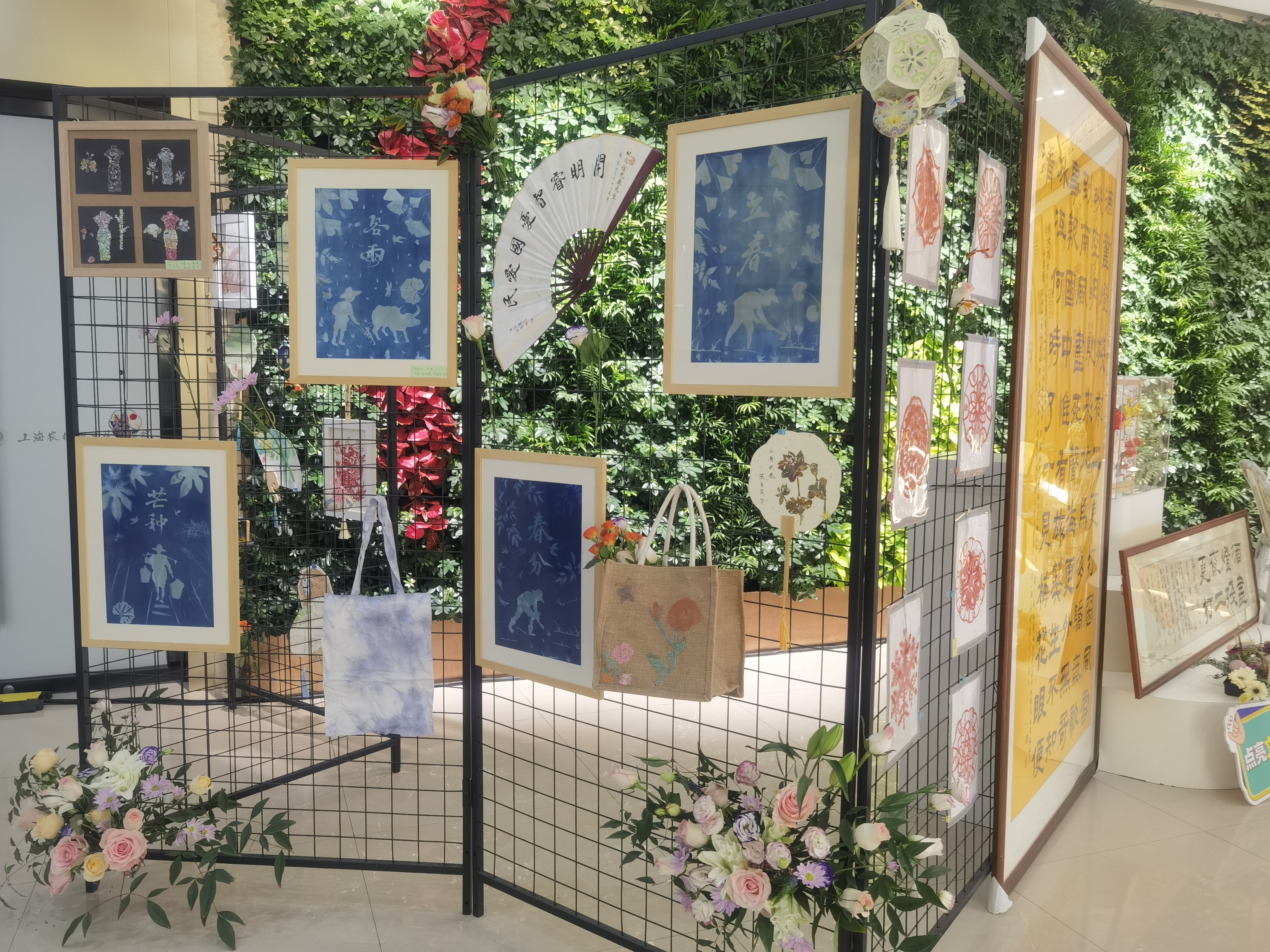 来到非遗作品展示区,从笔走龙蛇的创意书法到古风盎然的手编团扇,从精巧细腻的剪纸到憨态可掬的非遗主题黏土作品,各类展品尽显“古法新意”。叶榭软糕、松江布香囊、宋锦包、漆扇等非遗体验点则吸引了不少同学驻足,更有手巧的师生现场包起了青龙饺,展厅里顿时香气扑鼻。