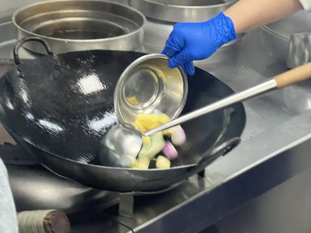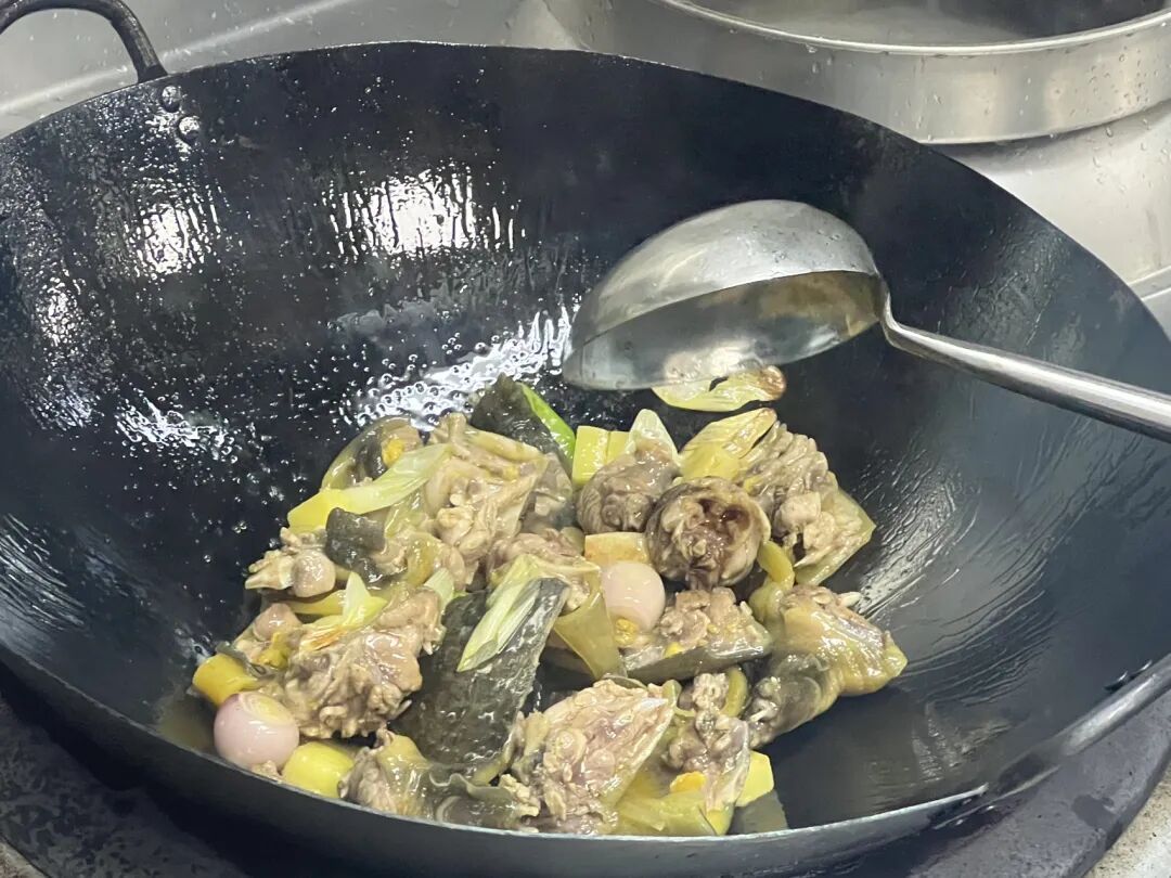 4.然后下入蒜、葱段、干葱头,继续煸炒出香味,放甲鱼。