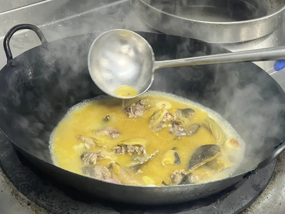 5.沿着锅边淋入料酒,加入浓汤(汤水要淹没过甲鱼),接着加入黄贡椒酱、螺丝椒、香菜。调味:鸡精、味精各一勺,少许白糖提鲜,蚝油和东古酱油适量。